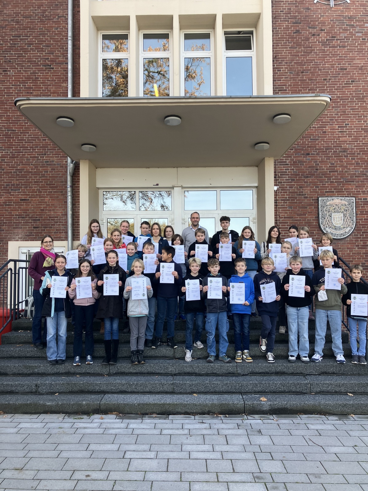 20.11.2025 – Auf Schulebene haben in diesem Jahr rekordverdächtige 43 Schülerinnen und Schüler erfolgreich an der 1. Runde der Mathematik-Olympiade teilgenommen. Am Freitag, dem 14.11., erhielten sie nun alle ihre Urkunde aus den Händen des Schulleiters Jonas Rickert und der Betreuerin des Wettbewerbs Kerstin Brinker.