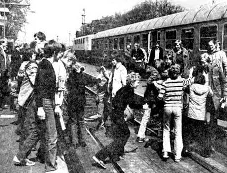 | Herzlicher Empfang für die Deutschen Volleyballmeister auf dem Hiltruper Bahnhof. Fotos: HH, Münstersche Zeitung 08. 05. 1979 |