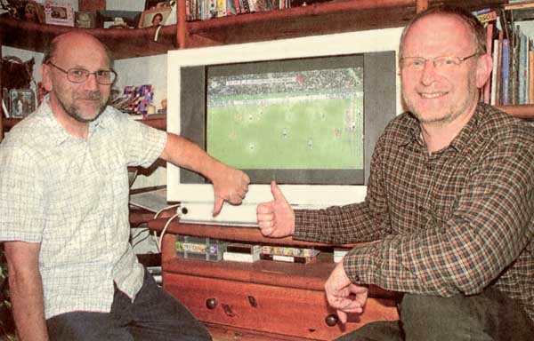 | Der Waliser Trevor Wood (Daumen runter) und Franz Josef Ruwe (Daumen hoch) verfolgten am Mittwoch mit einiger Spannung das deutsch-walisische Fußballspiel. Foto: beg |