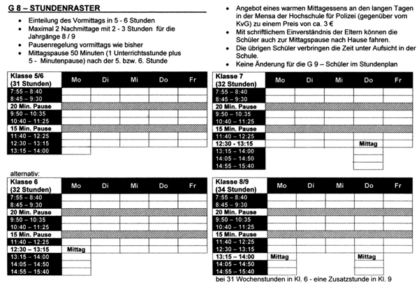 | Stundenraster für G8-Schüler (Einschulung am Gymnasium ab 2005) |