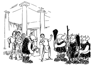 Wir befinden uns im 3. Jahrhundert nach Christi Geburt in Köln am Rhein, das damals „Colonia Agrippina“ hieß und zum römischen Reich gehörte. Einheimische und Römer leben hier friedlich nach römischer Sitte und Lebensart zusammen. Es gibt Schulen, in denen römische Schüler unterrichtet werden, deren Eltern in Köln leben. Sie lernen lesen, schreiben, rechnen, etwas über römische Geschichte, vor allem aber, daß die Römer die Herren der Welt sind.