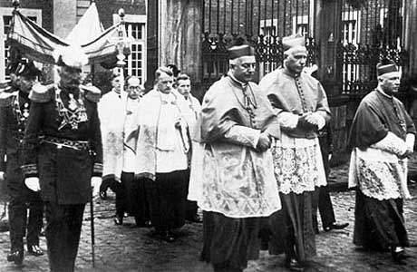 | Die Bischöfe Berning aus Osnabrück (l.) und Bornewasser aus Trier geleiten Clemens August Graf von Galen am 28. Oktober 1933 vom Bischöflichen Palais zur Bischofsweihe im Dom zu Münster |