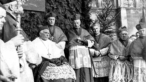 Nach seiner Rückkehr aus Rom wurde der zum Kardinal erhobene Bischof von Münster, Clemens August Graf von Galen, am 16. März 1946 vor dem zerstörten Dom in Münster von den Domkapitularen und einer begeisterten Menschenmenge empfangen. Foto: WN 18. 11. 2004 |