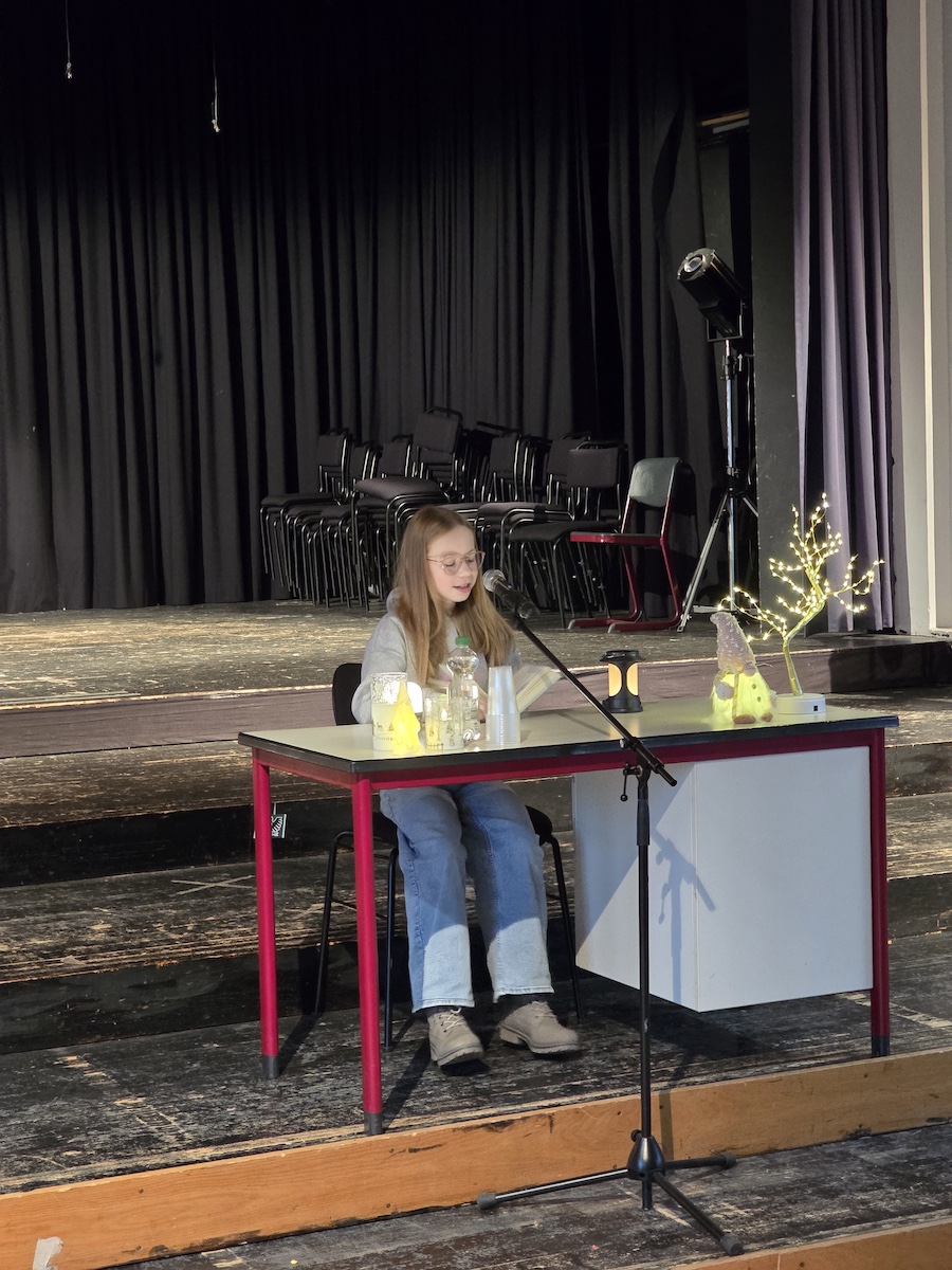 Die Entscheidung der Jury fiel knapp aus, da die im Workshop professionell vorbereiteten Schüler*innen mit einer sehr guten Lesetechnik und starken Interpretationen überzeugen konnten. Am Ende verkündete die Jury den ersten Platz für Janna Schulz (6a). Alle Vorleser*innen freuten sich über Buchgutscheine der Hiltruper Buchhandlung, die Frau Schmuck großzügigerweise beisteuerte, und eine weihnachtliche Aufmerksamkeit.
