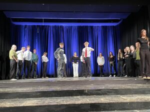 In einer Impro-Show nicht fehlen dürfen Darbietungen des Gesamt-Ensembles. Der Literaturkurs genoss auch diese Herausforderung, formierte sich bereitwillig zu einer „Zoo-Maschine“ und entwickelte beim Impro-Marathon und in den „Themen des Tages“ spontan und temporeich skurrile Mini-Szenen.