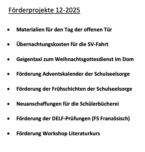 Aus dem gemeinsamen Topf der Beiträge von mehr als 600 Mitgliedern unterstützen wir in nahezu allen schulischen Bereichen. Ein Teil unseres Geldes steht auch immer für soziale Zwecke zur Verfügung. Das Wohl und der Nutzen für möglichst viele Schüler, besonders innovative Ideen oder auch die Berücksichtigung anderer Finanzierungswege geben uns dabei die Richtschnur über Höhe und Umfang unserer Unterstützung vor.