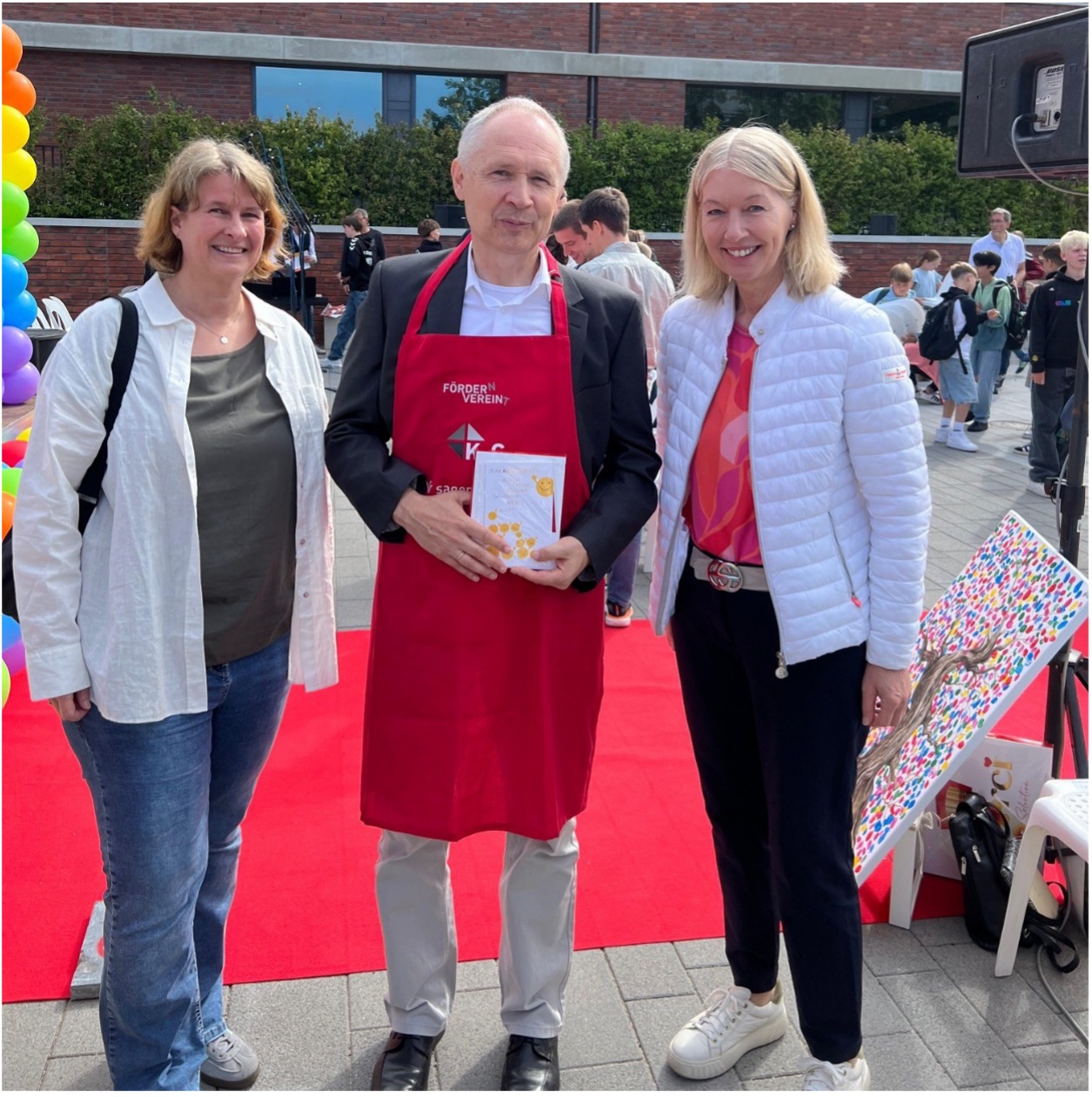 Stellvertretend für das gesamte Team dankten ihm Ute Kratzenberg und Anja Große Wöstmann für die langjährige gute Zusammenarbeit und überreichten ihm als Erinnerung zum Abschied eine rote „Förderverein-Schürze“.