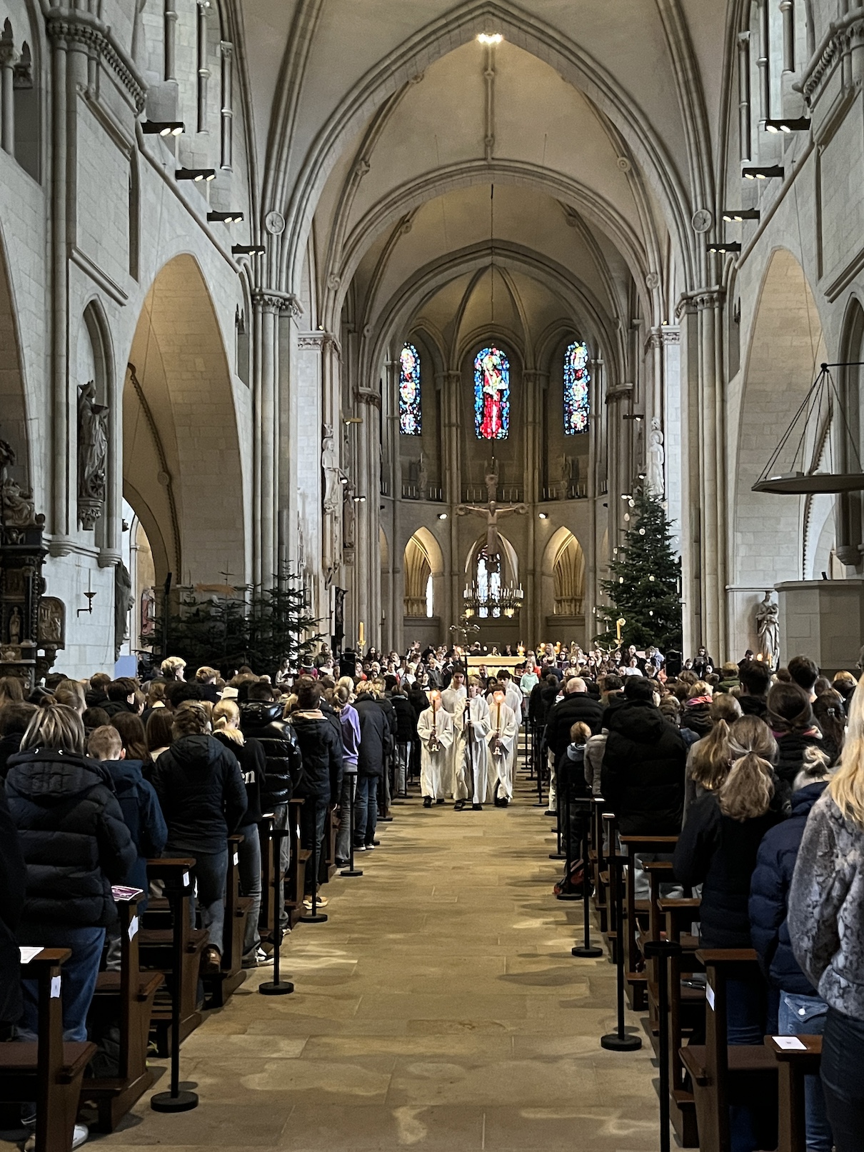 20.12.2025 – Gemeinsam Gottesdienst feiern im Paulus-Dom – das ist inzwischen Tradition der Schulgemeinde am letzten Schultag vor den Weihnachtsferien. Auch in diesem Jahr nahmen neben den Schüler:innen, Lehrer:innen und Mitarbeitenden zahlreiche Eltern, Großeltern und Ehemalige am Gottesdienst teil, den Bruder Konrad Schneermann zelebrierte.