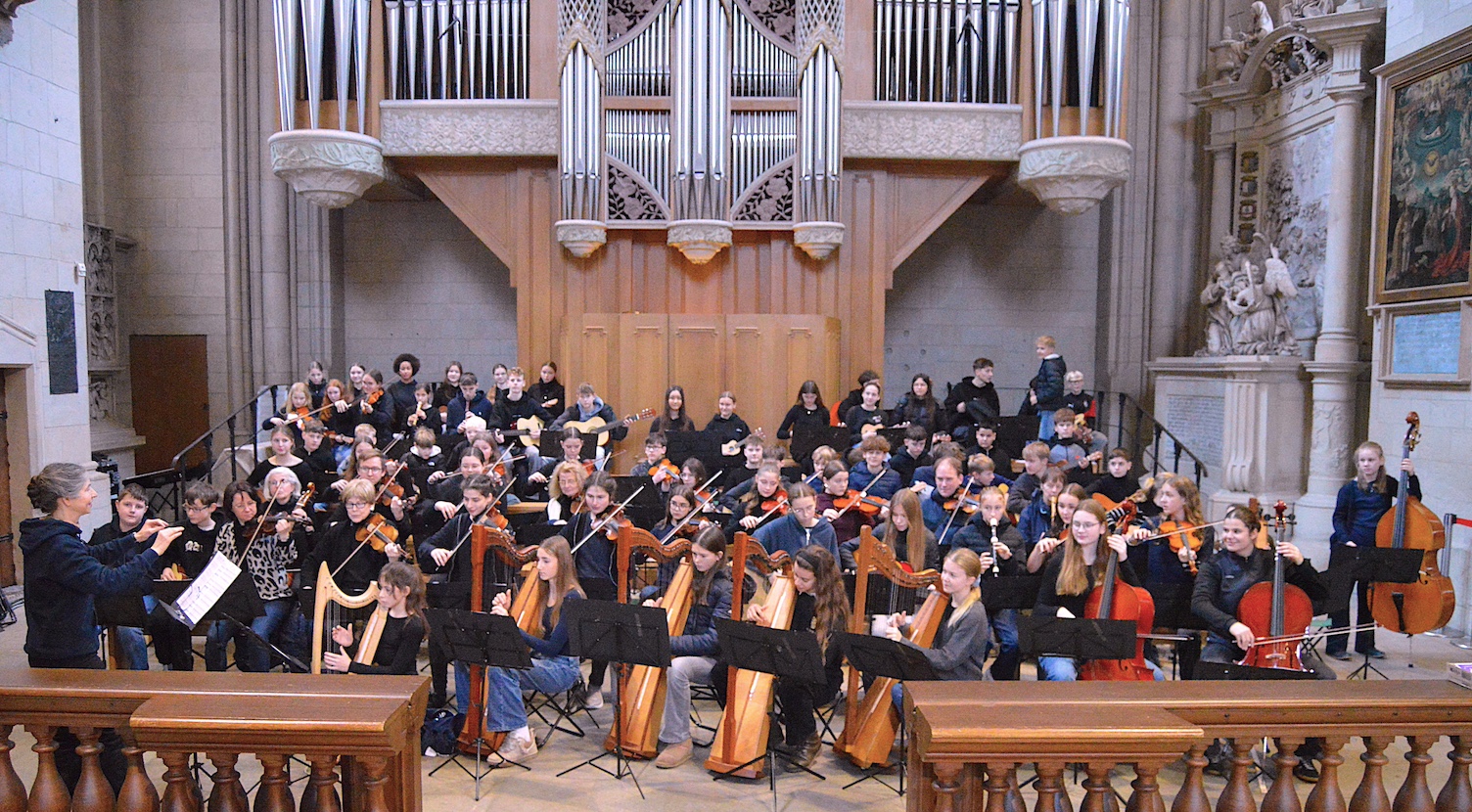 Zur feierlichen Atmosphäre trugen die knapp 200 Musikerinnen und Musiker verschiedener Ensembles bei: die Chorklassen der Jahrgangsstufen 5 und 6, das Orchester „Galissimo & Friends“ und die „Kleine vielsaitige Geigenmusik“.
